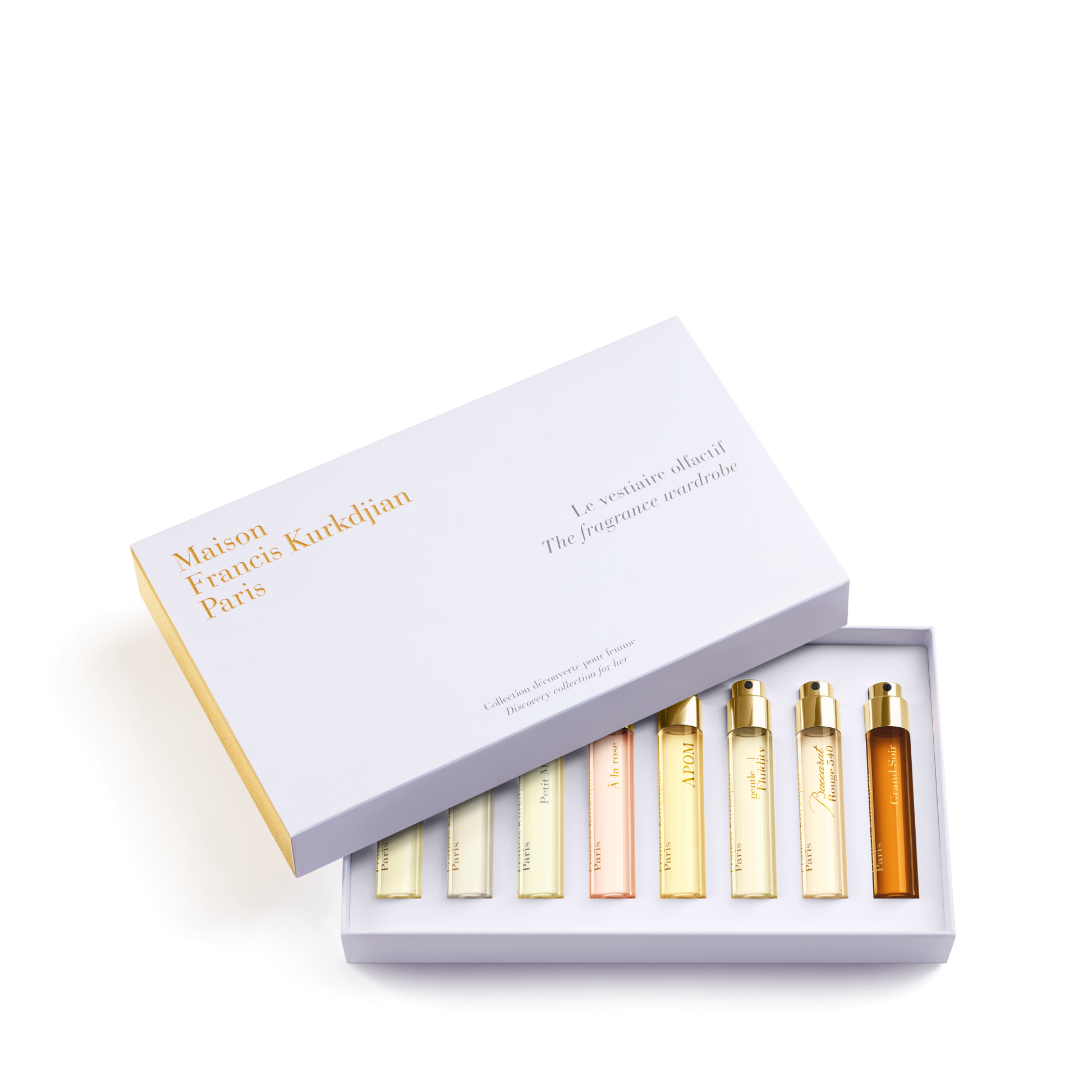 The fragrance wardrobe is an invitation to discover the Maison Francis Kurkdjian range of expression. This set features a selection of eight 11ml perfume refills, exceptional women’s fragrances for divine scents day and night. Each expresses a new facet of personality and embodies a mood, a style, a state of mind and more. This women's set is a perfect fragrance wardrobe where every woman will find a scent to dress her skin. An original gift idea.